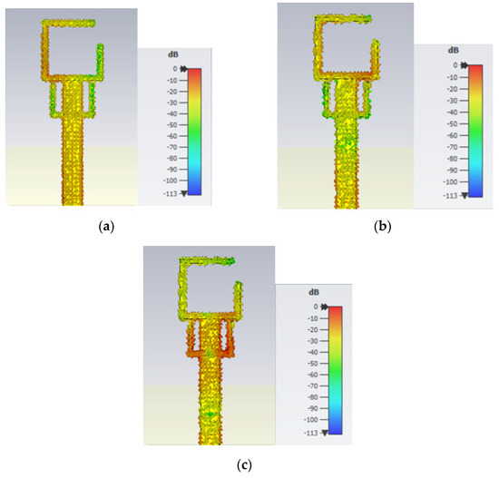 The simulated current distribution of the proposed design at (a) 2.4 GHz, (b) 3.7 GHz, and (c) 5.8 GHz.
