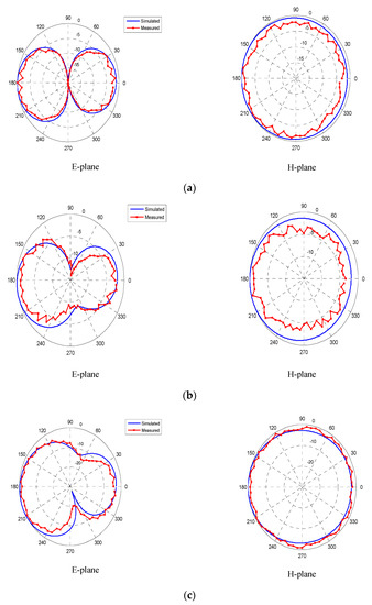 Radiation patterns of the proposed design at (a) 2.4 GHz, (b) 3.7 GHz, and (c) 5.8 GHz.