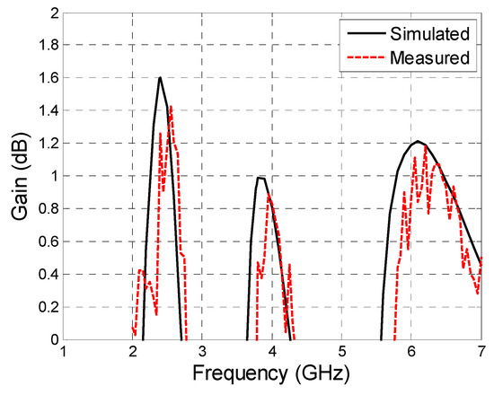 The simulated and measured normalized power patterns of the final structure at the three resonant frequencies are shown in Figure 13. The E-plane and H-plane patterns are bidirectional and omnidirectional, respectively, for all of the three bands, which is almost preferable for the IoT portable devices. According to these patterns, the radiation for each frequency is independent of the orientation of the IoT devices so that it facilitates the connection of the antenna with the other IoT devices. Figure 14 shows the variation of the simulated and measured gain values as a function of frequency for the three bands (2.25–2.55) GHz, (3.6–3.99) GHz, and (5.5–6.4) GHz. The maximum simulated and measured gain values are found to be equal to 1.6 dBi and 1.43 dBi, for 2.4 GHz and 2.55 GHz, respectively. The other two bands have maximum measured gain values of 0.9 dBi and 1.1 dBi. Furthermore, the simulated values of the radiation efficiency at each frequency band are 82.5%, 72%, and 68%, respectively, while the measured values are 80.02%, 69.89%, and 67.1%, respectively. Figure 15 illustrates the radiation efficiency as a function of the frequency for the proposed antenna. There is some deviation between the measured and simulated results that are due to many issues such as the imperfect engraving of the CNC machine, the inaccurate soldering of the SMA connector, irregular variation of the dielectric constant of the substrate along the frequency, and the reflections of the surrounding objects inside the anechoic chamber.