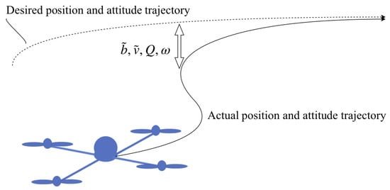 Figure 1 shows a schematic of tracking errors for a quadrotor UAV model, as the difference between the desired trajectory and actual trajectory. In this figure, denotes position tracking error and denotes translational velocity tracking error, both defined in the inertial frame.