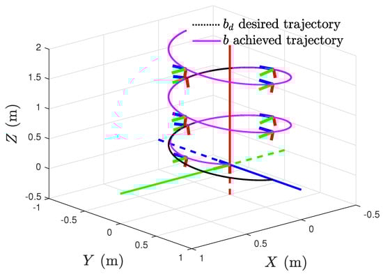 Here are positive definite matrices, is the UAV’s inertial position vector, , and are the desired inertial position and velocity vectors, respectively. To make meaningful comparisons, we use this outer loop position controller in all the following simulations to generate the desired attitude trajectory, while varying the inner loop attitude controller for comparison purposes. The feedback position controller (30) tracks a desired position trajectory in the form of a vertical helix going up in the z direction, as shown with a black line in Figure 3.