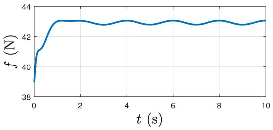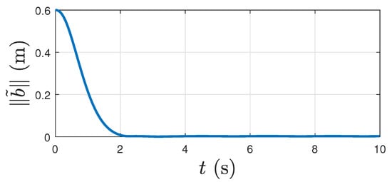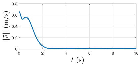 Figure 4 shows the magnitude of the position tracking error over time in the presence of the disturbance torque. It shows this tracking error reaches very low levels within 3 s. Figure 5 shows the associated velocity tracking error magnitude varying with time under the influence of disturbance torque. Figure 6 shows the thrust magnitude required to track the desired trajectory, under the influence of disturbance torque. Note that the thrust here is the sum of the four forces generated by rotors of the quadcopter. Each of these forces vary with time and affect the dynamics of the vehicle according to the Equation (44) in [], which is omitted here for brevity.
