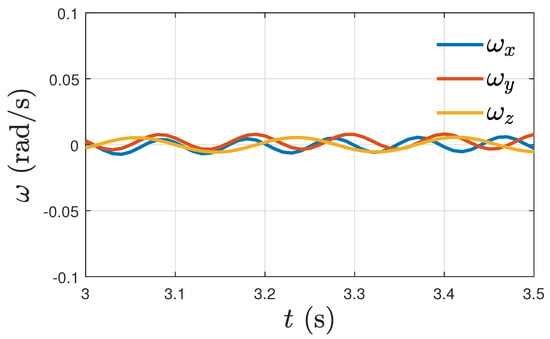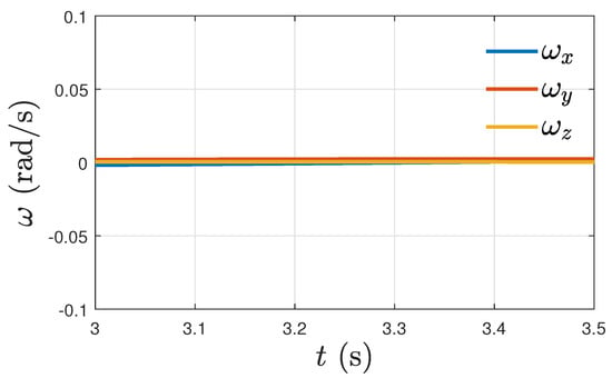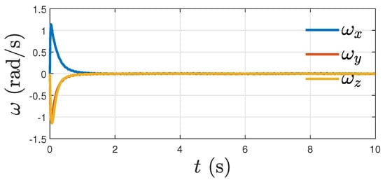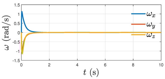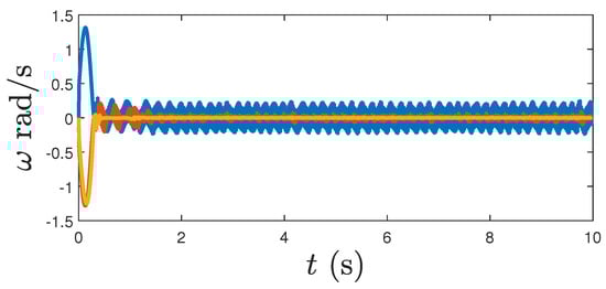 Figure 13 shows components of the angular velocity tracking errors over time, which converge asymptotically to zero. This case () can be thought of as an ideal case, and by comparing Figure 7 with the above figure, we see there is little change in the performance of the proposed controller under the influence of a disturbance. The time plots in Figure 7 show a similar tracking profile to the ideal case of zero disturbance (Figure 13).