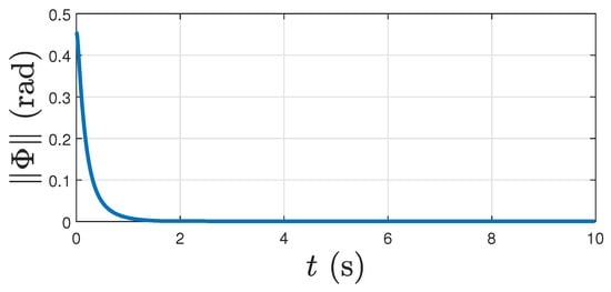 Note that global attitude stabilization with continuous feedback is not possible due to the non-contractible nature of the compact manifold SO(3) [,]. The almost global domain of convergence of the tracking errors to given by the above result is the largest that can be achieved with continuous state feedback. Further, note that the use of the Morse function leads to a set of four disjoint equilibria in the state space for the attitude and angular velocity tracking errors, , according to Lemma 2 and Theorem 1. This in turn leads to a larger domain of attraction for the desired equilibrium than that obtained by using a Morse–Bott function in the geometric PID tracking controller designs in [,], which give a connected set of equilibria for the tracking error dynamics.