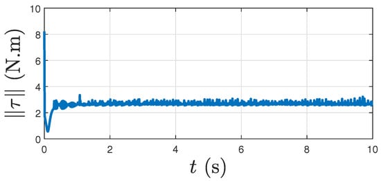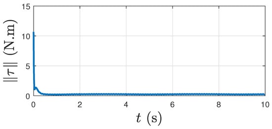 Figure 14 shows the control torque magnitude, as given by the proposed controller when there is no disturbance, i.e., . Again, considering this case as an ideal case, we see that the proposed controller performs robustly in the presence of disturbance. The profile in Figure 9 is similar (with minor oscillations) to that of Figure 14. The following zoomed-in Figure 15 shows that when the disturbance torque acts, components of converge to, and remain in, a small neighborhood of the zero vector, which is the expected result from Theorem 2. In addition, note that when there is no disturbance, components of converge to zero, as shown in Figure 16.