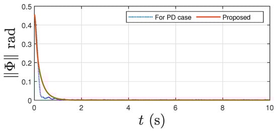 Norm of attitude tracking error for the proposed controller and the PD-type controller in [].