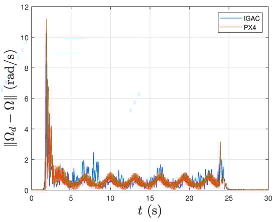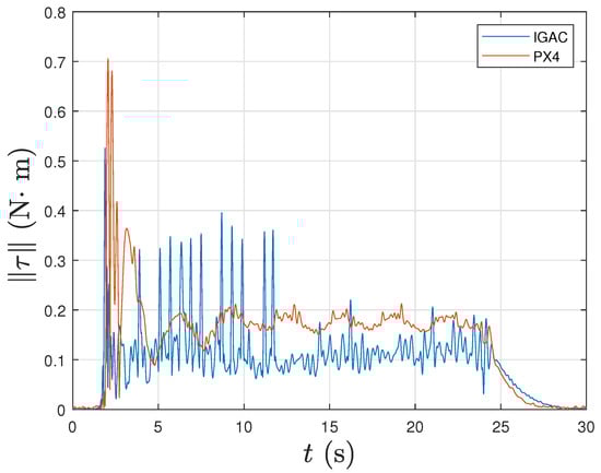 The magnitude of the attitude tracking error is given by the principal angle of the attitude tracking error Q, defined by (35) and shown in Figure 17. It can be clearly seen that the proposed geometric control scheme has a better attitude tracking control performance compared to the original PX4 controller. Figure 18 shows that the angular velocity tracking performance of the proposed control scheme is similar to the default controller in PX4. However, it is clear that the latter shows more high-frequency oscillations in angular velocity error than the former. Figure 19, shows that the proposed geometric PID control scheme requires less control torque magnitude than the PX4 controller during most of the flight. To summarize, compared with the original PX4 autopilot controller, the proposed control scheme demonstrates better control performance with less control effort and less high-frequency oscillations.