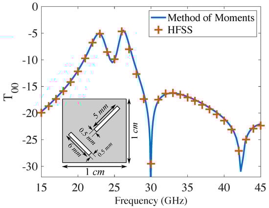 Let us validate the numerical method employed for the construction of the entries of the matrix of the Method of Moments using commercially available software. In our case, we employ the well-known Ansys HFSS software for the simulation of two slots of different sizes and orientation which constitute a square unit cell as depicted in Figure 2. To analyze such problem, the Green’s function has to be modified to account for the periodicity as shown elsewhere [41], but this has no impact in the validation of the numerical integration scheme presented here. In Figure 2, we analyze the transmission spectrum of two distinct slot apertures using the numerical approach presented in this manuscript. We have found that five basis functions ( and are sufficient to accurately reproduce the results from the commercial software.