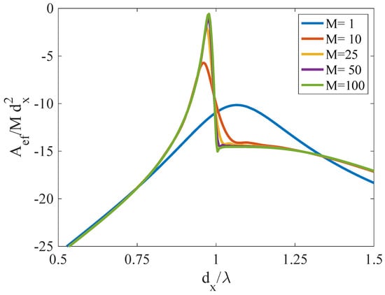 Normalized effective transmitting area of a finite chain of M slots with dimensions , for different values of M under plane wave illumination at normal incidence.