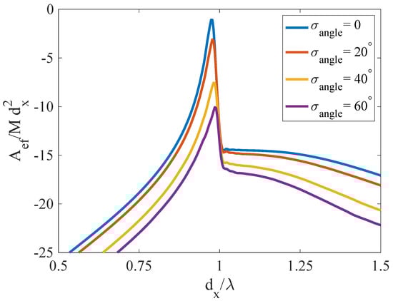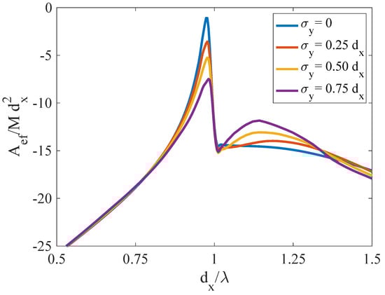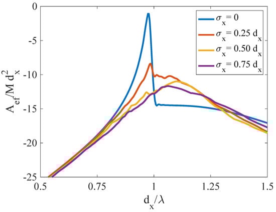 We see that, given (5), one expects the electric field amplitude excited in the slots to be reduced by a factor , which should be lower and lower on average with increasing standard deviation as even if the mean value of is zero, the cosine is an even function, therefore having a mean lower than one. This reasoning is consistent with the findings in Figure 4. Of course, such reasoning neglects the change in coupling between neighboring elements, but as has been found in many works [47,48], small rotations do not introduce big changes in the overall coupling among elements in large arrays, a condition used as a local periodicity which has yielded good results in the literature.