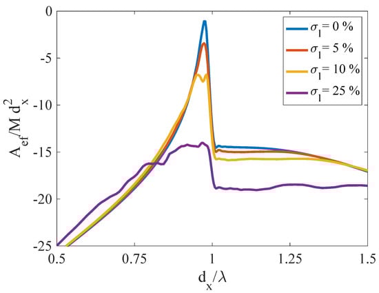 Let us now consider a different type of disorder, in which we modify the scatterer itself, and with that we modify the natural resonance of each slot. In the literature, it has been shown that the natural resonance of the slot itself plays a secondary role in the existence of extraordinary transmission, as long as it is located above the first transmission zero (i.e., the Wood’s anomaly). However, the precise location of the EOT peak is dictated by such resonance. As we did for the angle of rotation, let us consider now that each slot has a length given by with given by a constant plus a random value given by a normal distribution centered at zero with a standard deviation given by , which is given as a percentage of the value of . The frequency-dependent effective receiving area normalized to the surface of the strip is shown in Figure 5.