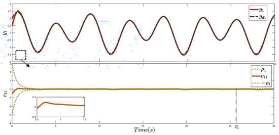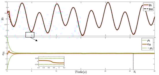 The proposed adaptive neural tracking control scheme with prescribed performance is established as follows. The control parameters are set as , , . The design constants for the adaptation laws are chosen as , , . The initial conditions are chosen as . All the basis functions are chosen as the Gaussian functions, which contain eleven nodes with the centers evenly spaced in and the width , , . The center of the receptive field , , , , , , , , .