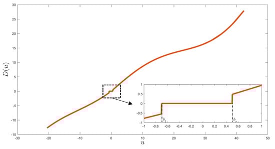 where is the control input, is the control output with nonlinear deadzone, are unknown time-varying positive continuous functions denoting the left and right slopes of the deadzone, two parameters and represent the break-points of deadzone nonlinearity, as shown in Figure 1.