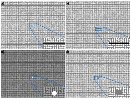 To evaluate the potential of the simulation tool in detecting very small flaws, four distinct imperfections were introduced based on [3], as shown in Figure 2. Figure 2a illustrates a total debonding 4 μm thick between plies 6 and 7. Figure 2b shows a bar-shaped delamination of 4 μm × 100 μm located at the center of ply 6. The acoustic properties of the media inside the delamination and debonding gaps correspond to that of water since the representation of epoxy/air interfaces are not viable with the k-Wave toolbox (more details in the Discussion section). A foreign body 23 μm in diameter was inserted at the center of ply 7, as shown in Figure 2c. Oil acoustic properties were attributed to this flaw since diverse particles, such as grease, hair, dirt, etc., can infiltrate during the manufacturing process [3]. The fourth simulated defect characterizes broken fibers, where the profile of some fibers is changed by epoxy, as illustrated in Figure 2d.