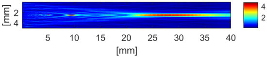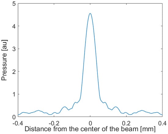 The radiation pattern of a 25 MHz transducer with 5 mm active diameter and 28 mm focal length used in the simulation is presented in Figure 3. The effective width of the ultrasonic field considered is 0.8 mm at the focus, as shown in Figure 4. This allowed the width of the computational grid to be greatly reduced from 12 mm to 0.8 mm, with a consequent decrease in processing time.