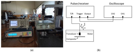 The ultrasonic experimental system illustrated in Figure 5 is composed by a Panametrics pulser/receiver model 5800, a Krautkramer immersion broadband focused transducer model JAP F-25.3.1 with 25 MHz central frequency, 28 mm focal length, 5 mm active diameter (like the simulated one), and a Tektronix digital oscilloscope model TDS1002B. After propagation through the composite samples, the ultrasound signals are collected, amplified, and filtered by the pulser/receiver. Then, they are displayed on the oscilloscope and saved for further processing. The transducer is moved using a computer-controlled micropositioning system.