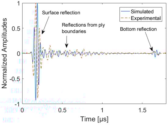 The simulated and experimental signals of a non-defective CFRP structure are presented in Figure 6. The reflected pulse on the composite surface (higher amplitude pulse) followed by low amplitude pulses from the ply boundaries is easily observed. The reflected pulse from the bottom of the plate is also visible in both figures; however, some filtering effect is observed in the experimental signal, leading to a lower amplitude and lower frequency content.