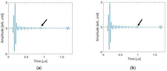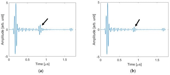 Then, the A-scan signals were obtained for the different simulated defects. Figure 7a presents the signal propagated through the structure of Figure 2a. The high-amplitude reflected pulse, marked in the graph by an arrow, demonstrates that delamination is detected without ambiguity.