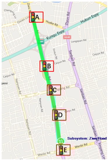 Distribution map of coordinated intersections of Ziwu Road. A: intersection of Ziwu Road and Changxing Road, B: intersection of Ziwu Road and Caiyun Road, C: intersection of Ziwu Road and Jingjiang Road, D: intersection of Ziwu Road and Yunyu Road, E: intersection of Ziwu Road and Wenbi Road.