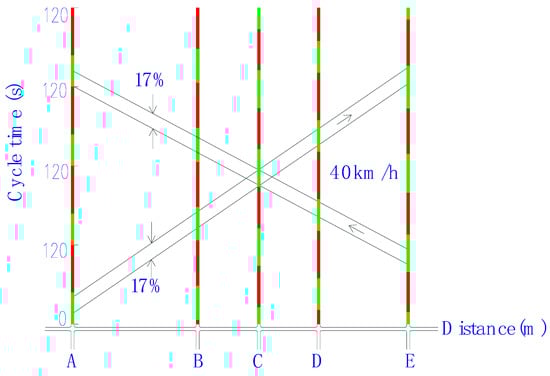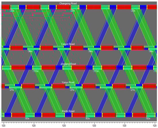 According to the trial calculation, the ideal cycle time of the intersections under green wave coordinated control is about 100 s. At the same time, combined with the traffic volume data of all intersections, the optimal cycle time of each intersection is about 125 s, as calculated by using the signal timing strategy of isolated intersection control. Therefore, 120 s is selected as the common cycle length of all five intersections comprehensively.