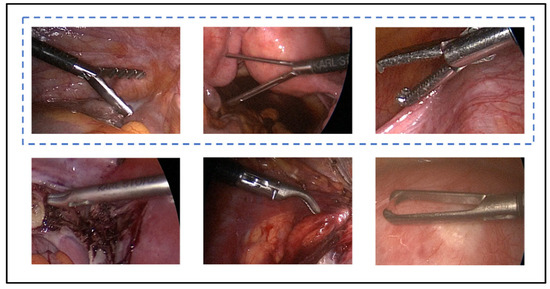 In total, 26 surgical tools were present in the videos. However, these tools can be grouped into main classes with respect to functionality. For instance, several types of tools were used to perform grasping, for such diverse purposes as grasping tissues or holding a surgical needle. Figure 1 shows six types of graspers used in the procedures in the Gyna08 dataset. However, only three of those types, which are shown in Figure 1 in the blue dashed box, were similar to the graspers used in the other datasets, and thus formed the grasper class.