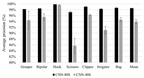 Results of generalisation to new subjects. Average precision of tool presence detection for all tools yielded by CNN-80S model (back bars) and CNN-40S model (grey bars). Note the truncated scale of the y-axis.