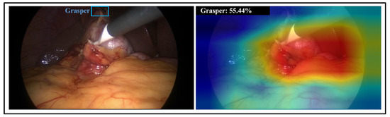 (left) a laparoscopic image containing a hook and grasper (in blue box) appearing in the dark area; (right) visualisation of class activation maps and prediction probability for grasper class obtained by CNN-80S model.