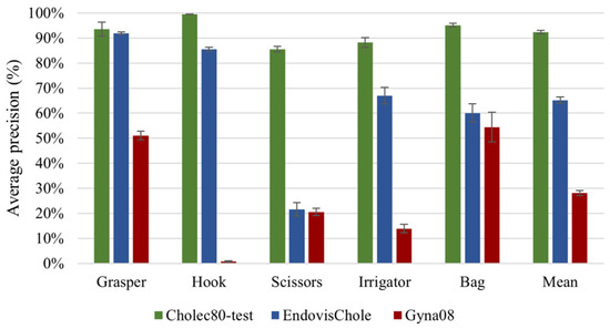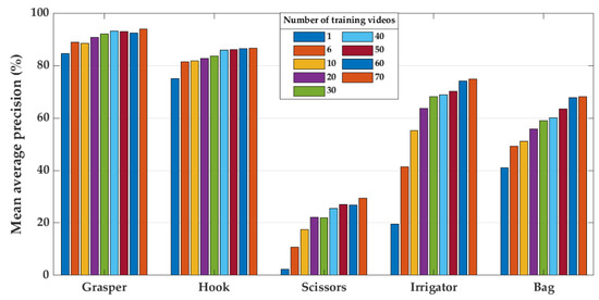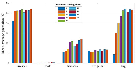 Because certain surgical tools are used more frequently than others (Figure 2), it requires much more surgical data to enable CNN models to accumulate a broad range of knowledge regarding their geometry in an image. In particular, the accumulation rate of images with scissors is less than for other tools. Hence, the AP when classifying scissors showed a continuous improvement with the use of more videos for training (Figure 10). However, the AP for scissors was less than 30% in both testing sets (EndovisChole and Gyna08 datasets, Figure 10 and Figure 11). Thus, it can be expected that more data enables better identification of the tool type. On the other hand, the bag and irrigator had a higher occurrence rate than the scissors (Table 1). Both tools had similar sample incidences (Figure 2), and therefore, both tools had a roughly similar improvement trend in classification performance on the EndovisChole dataset when the training set was expanded. Figure 10 implies that thirty training videos (containing ~4 k images of positive instances for the bag and the irrigator) are required to achieve a generalisation performance greater than 60% to data of the same procedure type. The grasper and hook images in the first six videos of the Cholec80 dataset (~9 k tool images) were sufficient to achieve AP of 89% and 81%, respectively, on the EndovisChole dataset, and training with more videos showed diminishing returns in model performance (~5%). These results imply that CNN model tool classification performance is improved when the quantity of training samples containing that tool increases. However, this improvement becomes saturated at a certain quantity.