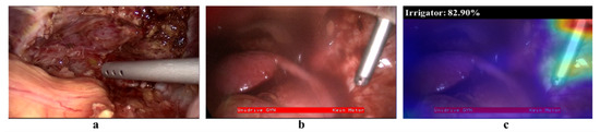 The low classification performance on the irrigator in the Gyna08 dataset was due to the presence of a trocar. In particular, the trocar had a shape that was quite similar to the irrigator in certain procedures. Hence, the model classified trocar images as containing an irrigator, and therefore the false positive rate of the irrigator class increased. Figure 8 shows two images form the Gyna08 dataset. Figure 8a,b shows images with an irrigator and a trocar, respectively. The activation map of Figure 8b for the irrigator class is shown along with the yielded prediction probability (82.9%) in Figure 8c.