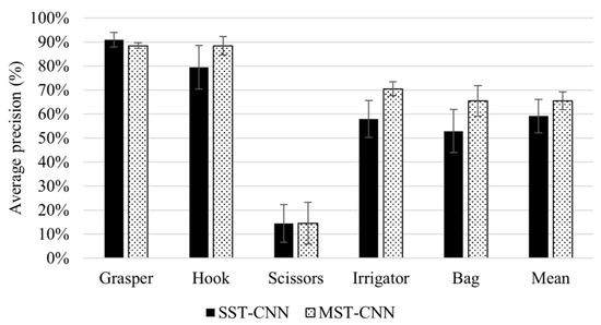 The impact of training a CNN model on data from multiple surgical sites on generalisation performance was investigated in Experiment 5. To produce a broad analysis, Experiment 5 was conducted on various CNN models with different depths and numbers of parameters. Figure 12 shows that the multi-site training achieved higher mean AP on all tools compared to single-site training. Training with data from different surgical sites enhances data representativeness, and therefore improves model generalisability. The improvement in generalisation performance was reported for the hook, irrigator, and bag, with 8.93%, 12.56%, and 12.56% improvements, respectively. However, multiple-site training did not improve the performance for the scissors. Both training strategies (single- and multi-site training) failed to train the models for detecting scissors due to the very small number of samples belonging to this tool in the training sets.