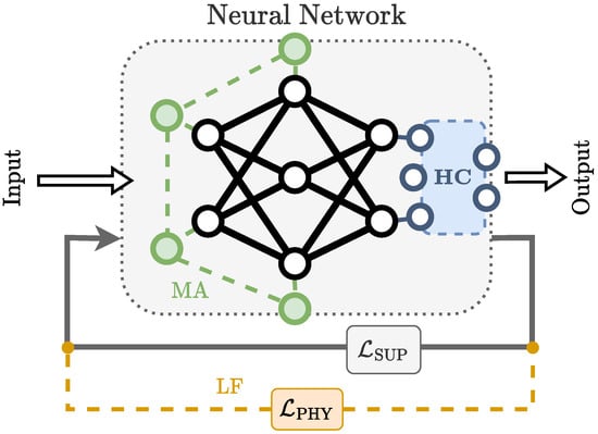 - Beucler, T.; Pritchard, M.; Rasp, S.; Ott, J.; Baldi, P.; Gentine, P. Enforcing Analytic Constraints in Neural Networks Emulating Physical Systems. Phys. Rev. Lett. 2021, 126, 098302. [Google Scholar] [CrossRef]