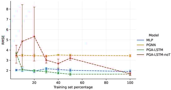 In Figure 2, we compare the performance of the PGNN algorithm, its counterpart without the physical loss function (denoted MLP), and the algorithm PGA-LSTM on different training sets, alongside an additional experiment for PGA-LSTM without the temporal features extracted by the encoder (denoted PGA-LSTM -noT). The first notable observation is that the PGNN physical loss function does not contribute beneficially to any subset of the training set. On the other hand, the simple MLP achieves a valuable performance compared to other models by being the second best performing model after PGA-LSTM and is even tied for small percentages of the training set (10–20%). This suggests that the theory-based contribution may be limited for this simple problem. On the other hand, using the encoder to extract temporal features in PGA-LSTM contributes greatly to improving the results over PGA-LSTM -noT, especially for small training sets.