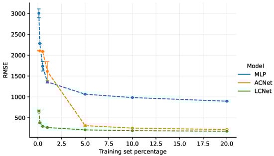 In Figure 3, we compare a purely data-driven MLP architecture and the two theory-guided solutions LCNet and ACNet. Due to the much larger dimension of the data set (171 Gb compared to the few Mb of the other use cases), experiments are reported for 1–20% of the training set, with a clear asymptotic trend suggesting unsurprising behavior at larger sizes. With the largest training set (20%), the MLP achieves an RMSE of , about four times higher than the two theory-guided approaches, with LCNet and ACNet at 176 and , respectively.