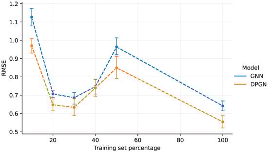 We know from the work of Seo et al. [23] that a data-only MLP solution performs much worse compared to these two architectures: To avoid repetition, we refer readers to [23] for details on this aspect. In our experiments, we observe that the DPGN outperforms the GNN in all training subsets, by a fairly constant margin. Both models show an unexpected behavior with a decreasing performance for the training set fraction between and . We hypothesize that this behavior can be explained by seasonal trends, which are not currently accounted for in our results.