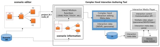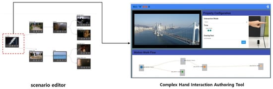 Figure 2 explains how the ComplexHI authoring tool is linked to the scenario editor and how the complex motion is generated in conjunction with the scenario editor. A scene in the scenario editor is represented by a node. When the creator clicks on a specific scene node, the ComplexHI authoring tool is started and a screen appears, where the creator can authorize an interaction. The creator configures the user’s device and edits the story by editing the complex hand interactions. The edited interaction information is stored in a form of metadata which is parsed at the time that the IMP is played.