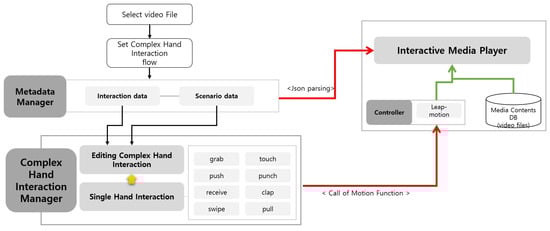 As shown in Figure 3, the ComplexHI consists of a metadata manager for generating and managing metadata for complex motion behavior, a complex motion manager for user hand motion recognition, and an interactive media player for recognizing and viewing user interactions. After the creator executes on the composite motion editor, the interaction metadata and the scenario data are generated for the creation of the composite motion. This is automatically generated when the user sets the motion flow in the GUI. The generated metadata, in turn, automatically parse the metadata when the user watches the media and goes through a motion recognition process in conjunction with the complex motion manager when the corresponding motion interaction occurs. The Interactive Media Player (complex motion player) is equipped with a parser that can parse the metadata produced by the composite motion editor, so that it interprets the composite motion metadata and recognizes them in conjunction with the motion function when a specific user interaction occurs according to the metadata information.