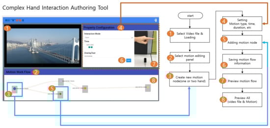 Figure 4 shows the operation flow chart of the complex hand interaction authoring tool and the GUI. The video file to which the complex hand interactions is to be applied is loaded and a list of single hand interaction is placed in the motion flow editor for complex hand interactions production. A single hand interaction is expressed as a single node, where a complex motion can be created by connecting multiple nodes. After arranging a single motion, one can set the properties of the motion and preview each motion. In addition, in order to confirm that the motions composed of multiple nodes are actually applied to the video, they can be checked with a preview function. Furthermore, the Motion Flow Editor helps one to freely edit and create complex motions on a node-by-node basis.