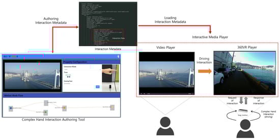These days, with the advance of digital broadcasting, the media environment provides users with an opportunity to enjoy differentiated contents in a more aggressive fashion through user-media interactions based on computer technology. In this paper, we first proposed an interactive media player that can recognize the user’s motion and control the video in a web service environment without installing any specific program. Then, we proposed and developed an interactive media authoring tool with which immersive interactive media can be produced and enjoyed. The authorizing tool is able to create complex two-hand interactions based on single one-hand actions as it can compose and edit the hand motions with mere hand interactions with the authoring system. This is the first time that an authorizing system is proposed to authorize complex two-hand motions from single hand motions, as most of the authoring tools authorize interactions by programming. The complex hand interaction authoring tool makes it possible to apply complex hand motions to diverse contents without the need for programming. With the proposed system, it is possible to create any kind of custom or composite motions. It is expected that, in the future, the proposed system will allow individual creators to produce their own composite motion and gain competitiveness through differentiated composite motion production. Furthermore, it is anticipated that the proposed system can be applied to areas such as tourism and education as the authoring tool would be useful in producing funny and informative interactive educational and advertising content easily. In order to develop complex hand interactions effectively in the future, object control algorithms through user interaction that are grafted with object control technology will be studied. In addition, research will be conducted to automatically recognize user devices in conjunction with multiple contactless devices.