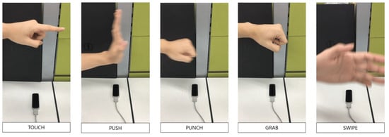 A single hand interaction can be developed either for a one-hand interaction or a two-hand interaction. Whether it is used for a one hand or two-hand interaction can be configured by setting the mode to a ‘single’ mode or a ‘multiple’ mode. When a single hand Interaction has been developed for a two-hand interaction, it can be combined with any kind of other single hand interactions by combining the interactions in the Motion Workflow area in the authoring tool. The single hand Interactions described in Table 2 recognize the user hand motions according to Algorithm 1. Figure 6 shows the cases where the hand motions are recognized for each single hand interaction.