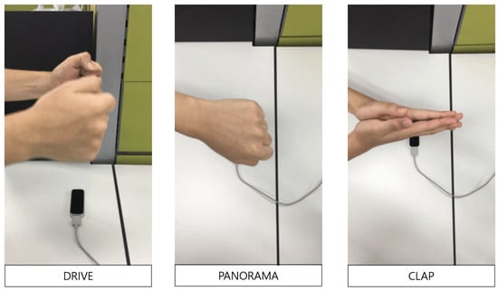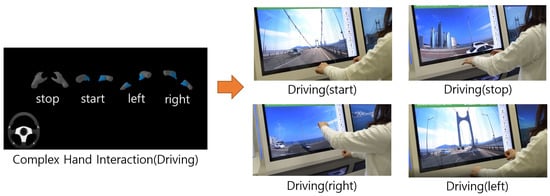 A complex hand interaction can be created in the scenario editor by selecting the complex hand induction authoring tool menu. Algorithm 2 is a general loop on how to open and initialize an edited complex hand interaction in the player software. Figure 7 shows the operation of a complex hand interaction, which shows Driving, Panorama, and CLAP Interactions. For example, the Driving Interaction uses two hands to adjust the left and right directions using the difference in the height between the two hands.The actual operation results of the Driving interaction are shown on the test result screen in the experimental results section.