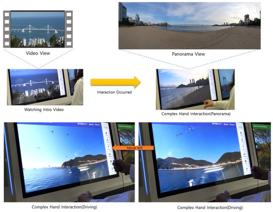 Figure 10 shows a kiosk product where the complex motion developed by the proposed ComplexHI is applied. It also shows a screen where the user experiences a Driving and a Panorama interaction while watching a 360 VR video played on the KIOSK. The 360 VR video was taken beforehand by a 360 degree camera while driving in a car through the driving scene. By providing the user with a non-contact interaction according to the complex motion, the user can enjoy the interactive content without any screen touch or sensor contact.