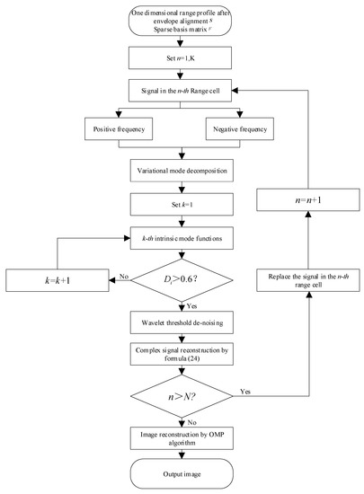 At present, there are many methods for signal noise reduction now, which can be divided into three categories: filter noise reduction [6,7]; signal transformation [8,9]; and signal decomposition [10,11,12]. The filter noise reduction method is mainly based on the statistical characteristics of the signal, and estimates the useful signal from the mixed signal or filters out the noise according to the prior statistical characteristics to improve the SNR. The widely used methods include: Kalman filter [13]; Wiener filter [14]; and adaptive filter [15], etc. However, these types of methods are relatively dependent on the prior information of the statistical characteristics of the signal and noise and have poor noise reduction performance and high computational complexity for non–stationary large bandwidth signals. The most common method based on signal transformation is the method based on wavelet transform. Wavelet transform has natural advantages in processing non–stationary signals due to its “Multi Resolution Analysis” characteristics. The de–noising methods based on wavelet transform can be generally divided into three categories: the wavelet threshold de–noising method; the modulus maximum de–noising method [16]; and the correlation de–noising method [17]. The threshold method is one of the most widely studied methods. Ref. [18] proposed an iterative wavelet threshold de–noising method which can achieve noise reduction by controlling all wavelet coefficients within the expected range, and it obtains good results. Ref. [19] applied wavelet threshold de–noising technology to ECG signal de–noising, and achieved a good SNR improvement, but the compromise threshold function it adopted did not have the adaptability to the signal. Ref. [20] applied wavelet threshold de–noising to image de–noising, which significantly improved the image quality and SNR. The signal decomposition noise reduction method is to decompose the signal into different components in different forms and analyze the obtained components to achieve the purpose of noise reduction. The main decomposition methods mainly include sparse decomposition, singular value decomposition, empirical mode decomposition (EMD) and other methods [21,22,23,24]. Among them, EMD algorithm is widely used because of its adaptability to non–stationary signals. On the basis of EMD, many kinds of analogous EMD signal decomposition methods have been proposed, such as Complementary Ensemble Empirical Mode Decomposition, Local Mean Decomposition [25], Empirical Wavelet Transform [26], etc. but these algorithms have the problems of endpoint effect and mode overlap. In 2014, Konstanin proposed the VMD algorithm based on the research of EMD, which improved the suppression ability of high–frequency noise by defining the narrow–band IMF. By reasonably presetting the modal decomposition value, the phenomenon of modal aliasing and end–point effect can be effectively suppressed, which has attracted extensive attention of scholars [27,28]. On the other hand, some scholars have applied deep learning technology to signal noise reduction, but this requires a large number of sample sets and is not supported by systematic mathematical theory [29,30]. A Bi–ISAR sparse aperture imaging algorithm based on CVMD and wavelet threshold de–noising under low SNR is proposed in this paper, the proposed algorithm can avoid the shortcomings mentioned above. After summary, the contributions are as follows: