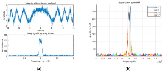 Noisy LFM signal decomposition results: (a) time domain and frequency domain diagram of noisy signal; (b) spectrum of IMF components.