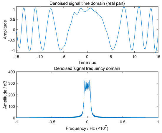 Since the VMD algorithm and DWT are only applicable to the real domain, and the radar signal is usually complex, this paper uses a complex signal decomposition method, which decomposes the complex signal into two real signals containing positive and negative frequency information [33]. By designing an ideal bandpass filter, the positive and negative frequencies of the analytical signal are extracted, and the frequency decomposition results are taken as the complex decomposition results. This method has no loss of noise signal energy. represents complex signal to be decomposed, represents its frequency domain form
