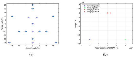 Simulation conditions: (a) scattering points model; and (b) Bi–ISAR simulation scenario.