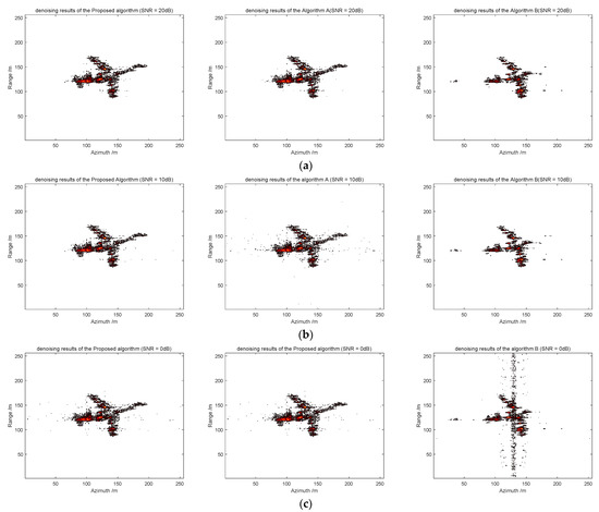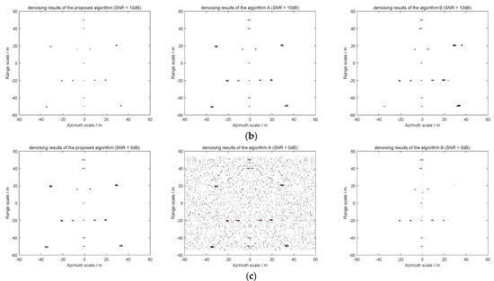 Simulation results 2: (a) imaging results under SNR = 0 dB; (b) imaging results under SNR = 0 dB; and (c) imaging results under SNR = 0 dB.