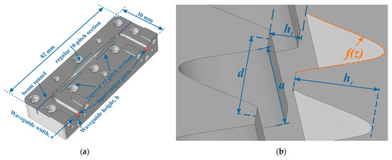 Performance of a BWO is influenced by the SWS []. The sinusoidally-corrugated waveguide SWS is one of the most promising for operation in millimeter and terahertz band because it has good transmission performance, reduced ohmic loss, and excellent heat-dissipation properties due to its all-metal structure. To further improve the interaction impedance, a TSW SWS was proposed []. The TSW SWS is convenient for use with a sheet electron beam because there is no need for machining a small-size beam tunnel []. Figure 2 illustrates the design of the TSW SWS circuit proposed in []. A 10-pitch regular TSW section, two 12-pitch tapered sections with a gradual reduction in corrugation depth, WR-15 rectangular waveguide sections, and input/output ports in the form of the UG-385/U flange comprise the design. The tapered 12-pitch sections are utilized to reduce reflections and offer a wideband-matched transition to a WR-15 rectangular waveguide. The dimensions of the interaction structure are the following []: Waveguide width a = 3.6 mm, waveguide height b = 1.8 mm, corrugation depth hc = 1.435 mm, period d = 1.4 mm, and beam tunnel height ht = 0.55 mm. The sine waveguide is a waveguide having sinusoidally corrugated E-planes, the profiles of which in the H-plane are determined by the formula below (see Figure 2b) [,,,,]:
