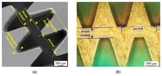 The findings of the morphological studies of the interaction structure fabricated of oxygen-free copper are presented in Figure 4. The results of the analysis of the morphological studies by scanning electron and optical microscopy are summarized in Table 1. The dimensions of the fabricated interaction structure are in good agreement with the numerical model except for the corrugation depth and corrugation curvature. This is mainly due to the used mills with a certain diameter of 300 μm. This problem is typical for fabrication of sine-waveguide SWS by micromachining [].