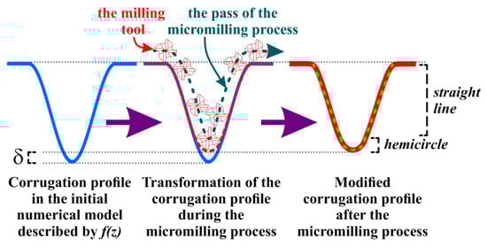 The results of the morphological study demonstrate that the corrugation profile in the microfabricated interaction structure slightly differs from the design. As a result, the previously indicated shape f(z) (1) does not exactly match the corrugation profile. It actually has a form that is comprised of two almost straight lines and a semicircle with an empirically determined corrugation diameter that is nearly equal to the diameter of the mills used. Therefore, the numerical model was modified to match the experimentally measured dimensions. The transformation of the corrugation profile is illustrated in Figure 6. The corrugation depth hc in the microfabricated interaction structure is clearly reduced (see Figure 6, where δ indicates the difference between the corrugation depth in the original numerical model and in the microfabricated sample). As a result, we apply the numerical model with a modified corrugation profile to verify the electromagnetic parameters acquired from the experimental measurements.