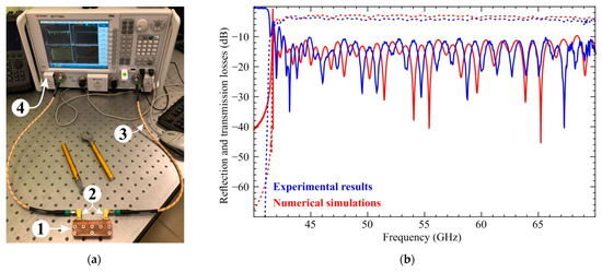(a) A photo of the experimental equipment used for cold-test measurements. The numbers denote: 1—Copper-made full-length interaction structure, 2—Coax-to-waveguide adapters, 3—Coaxial cables, 4—vector network analyzer; (b) a comparison of the experimental data (blue) and numerical simulation (red): the solid lines represent the reflection losses, while the dashed lines denote the transmission losses.